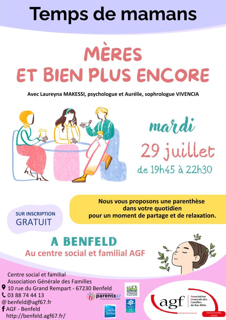 Au sein de l’AGF de Benfeld, je propose de co-animer avec Aurélie A. Sophrologue pour l’association Vivencia un temps à destination des Femmes-Mères, en soirée.